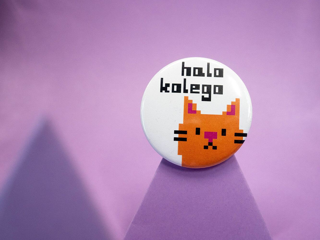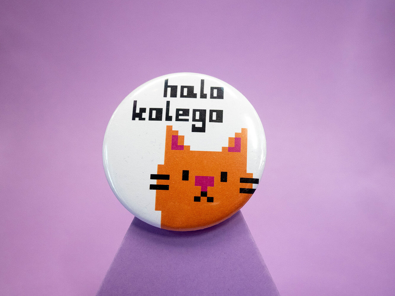 Przypinka z kotem Bamboszem o średnicy 58 mm.