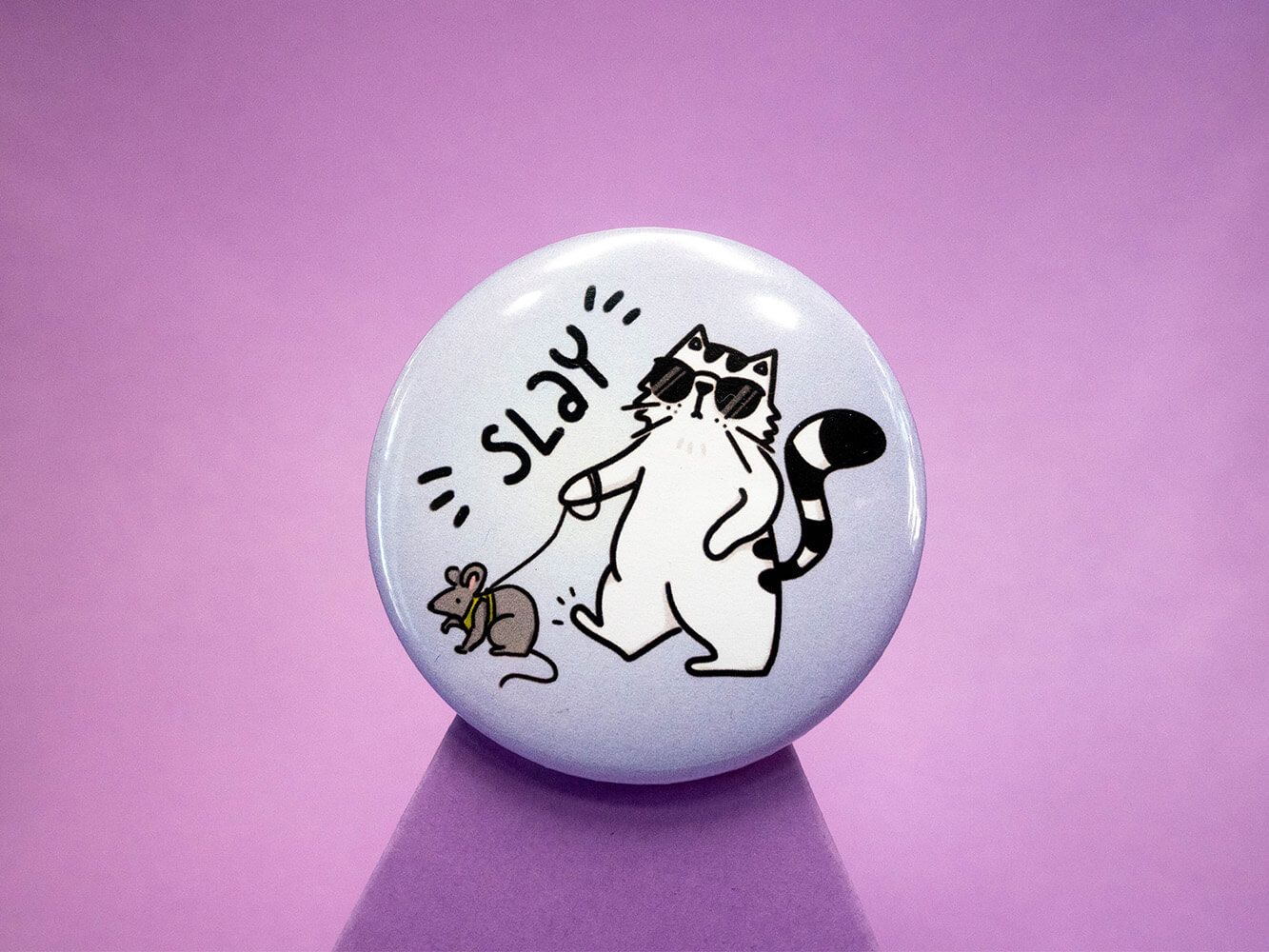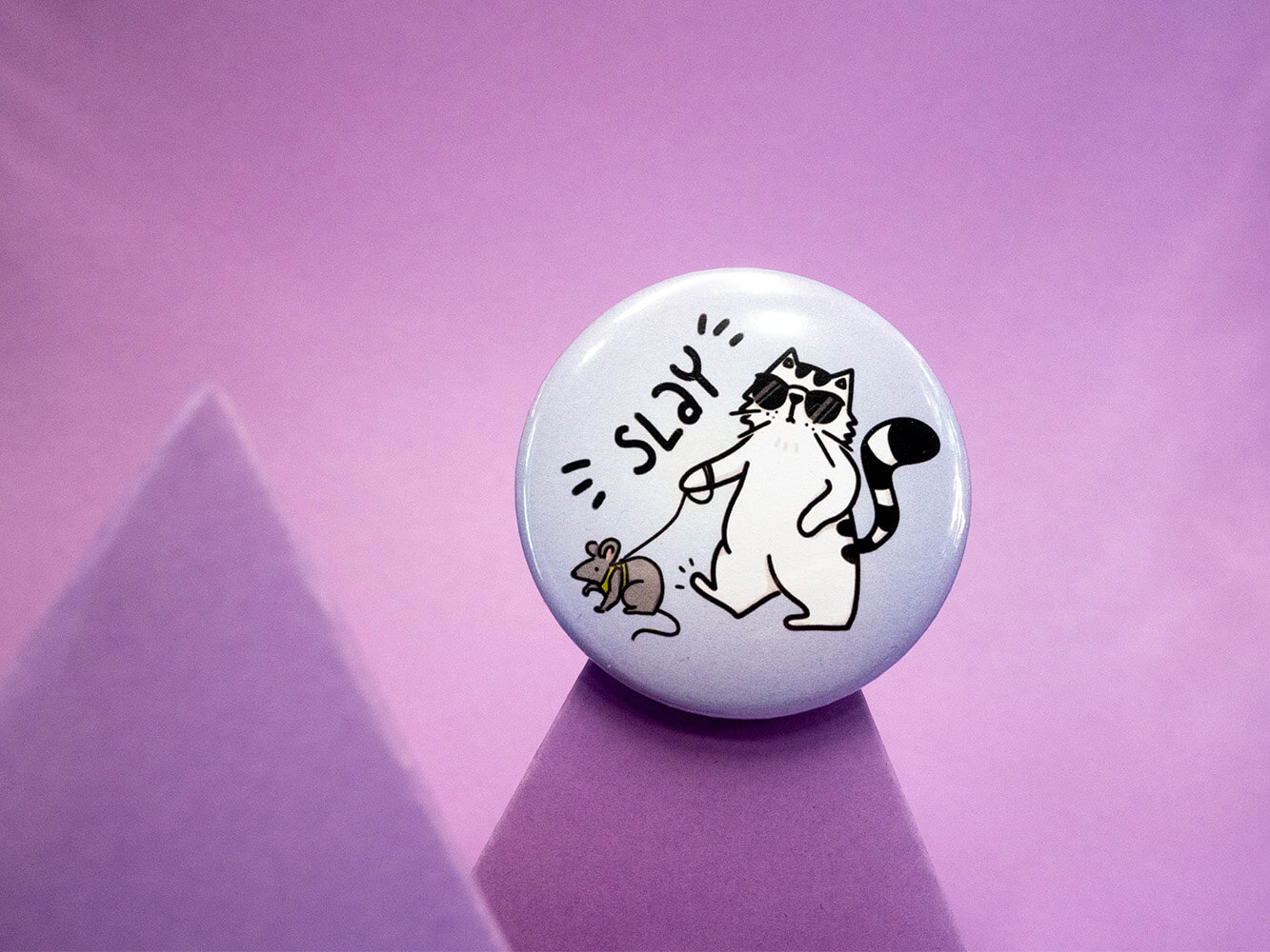 Przypinka z Panem Kotem Szczepanem, który wybrał się na spacer ze swoim domowym zwierzątkiem. A ponieważ Szczepan mieszka w centrum dużego miasta, jasne jest, że jego zwierzątko… To szczur!