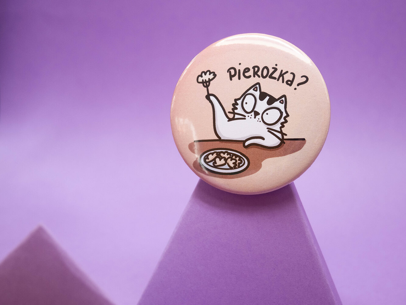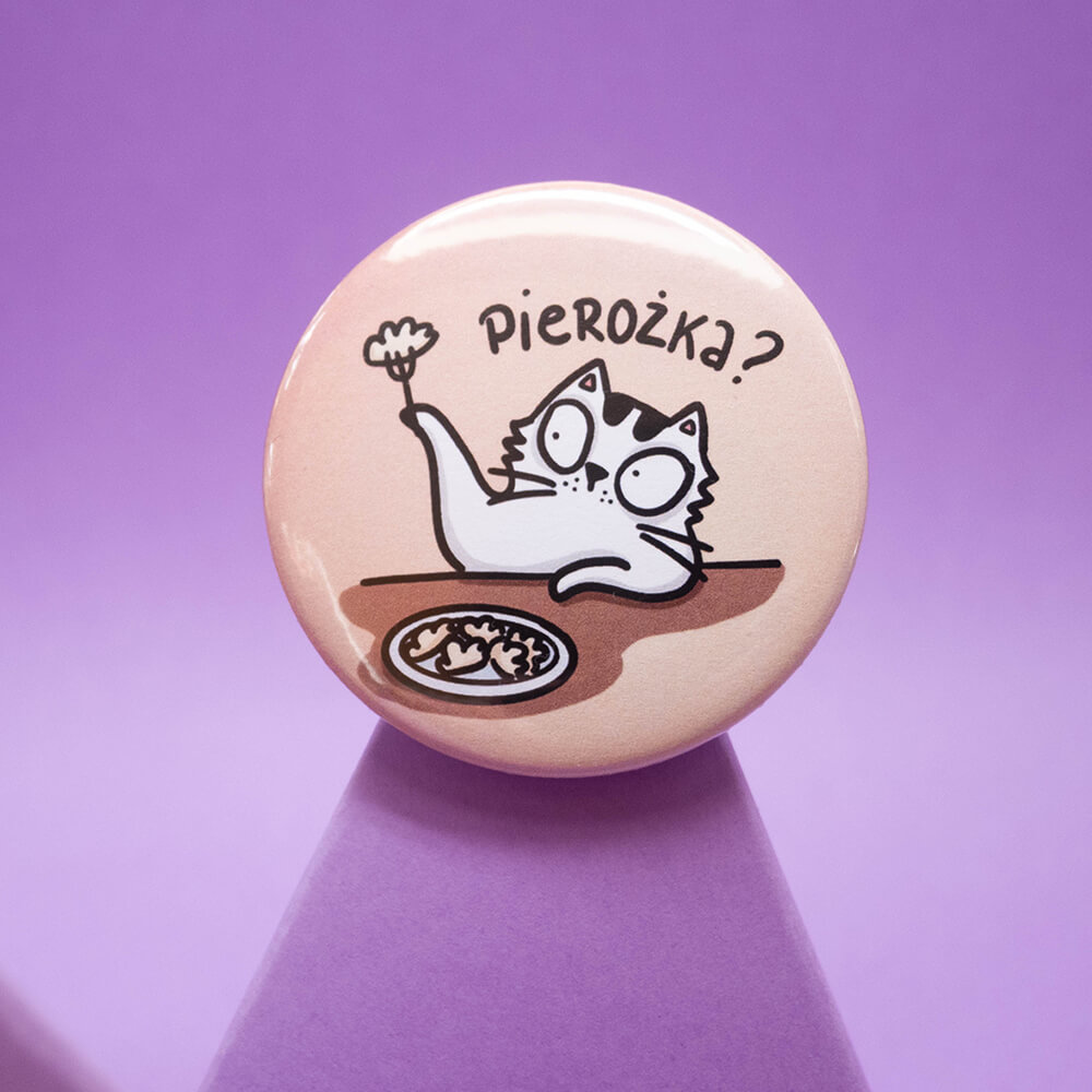 Duża przypinka Pan Kot Szczepan oferuje pierożka