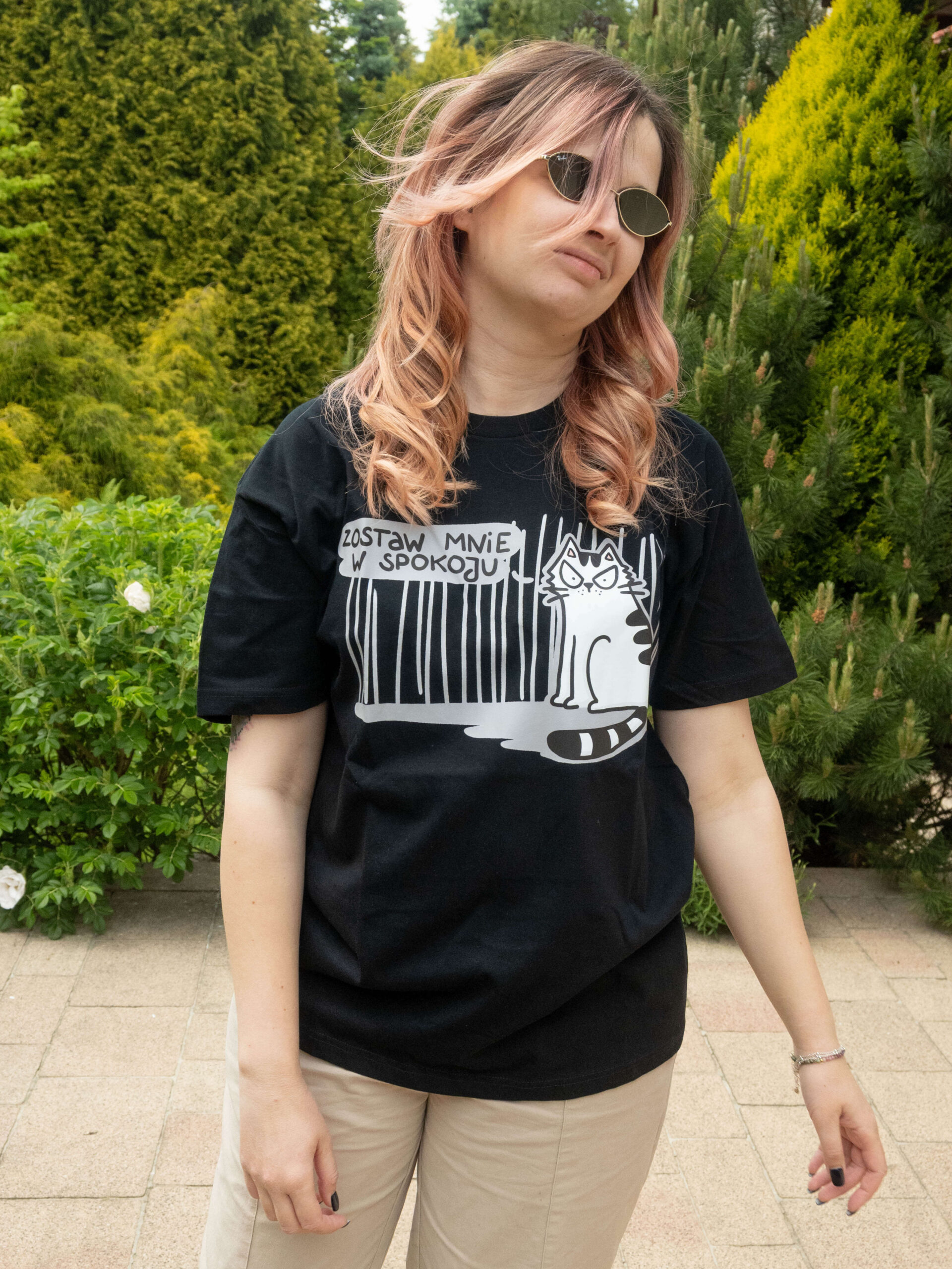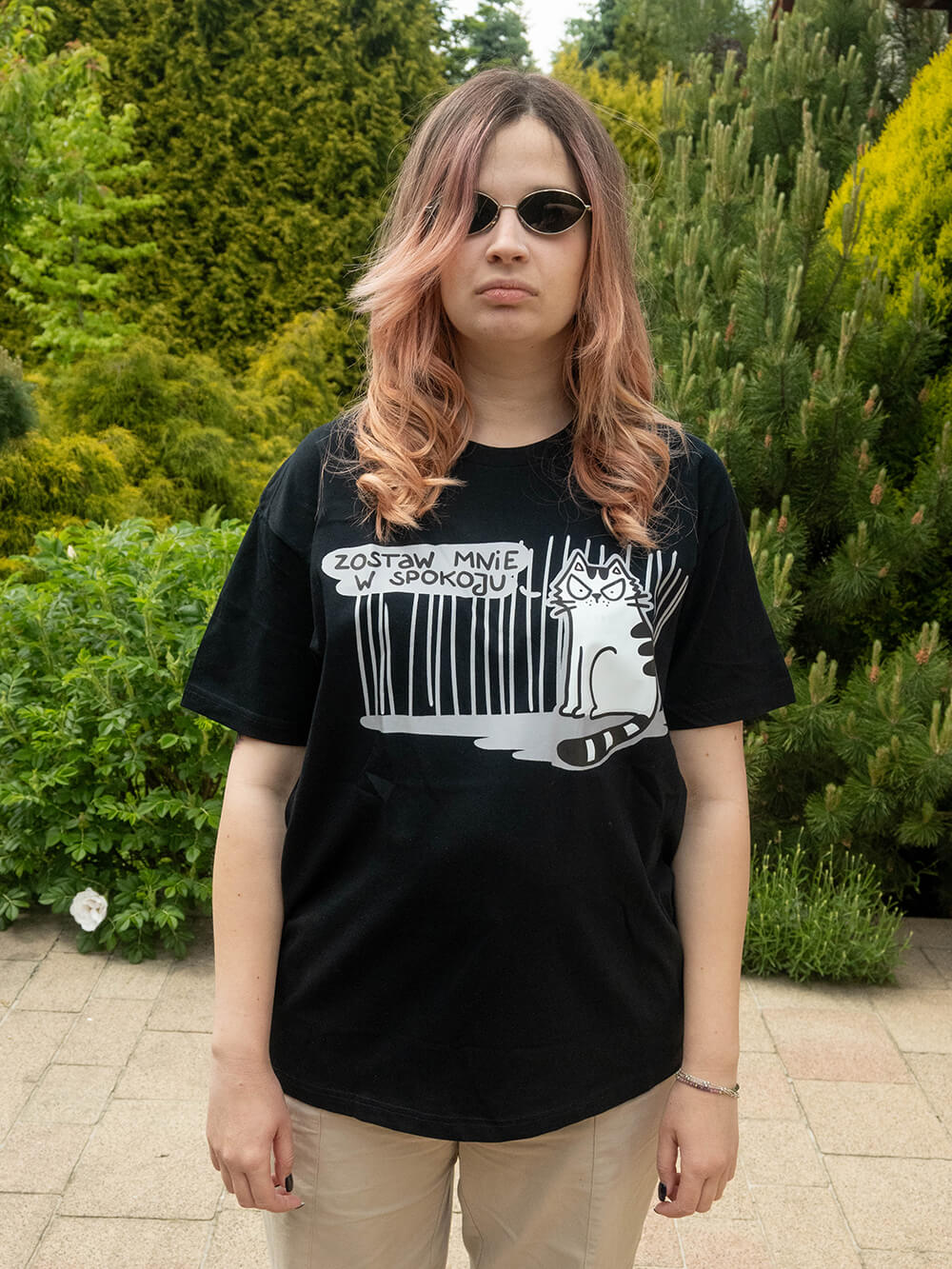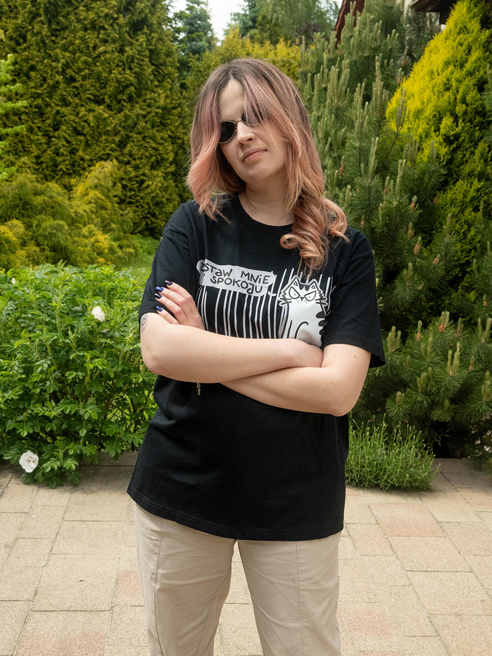 Czarny T-shirt z miękkiej bawełny o gramaturze 190 g/m2. Dłuższy krój i miękki materiał sprawią, że ta kocia koszulka szybko stanie się Twoją ulubioną! Każdy egzemplarz ozdobiony jest autorskim nadrukiem inspirowanym przygodami Pana Kota Szczepana.