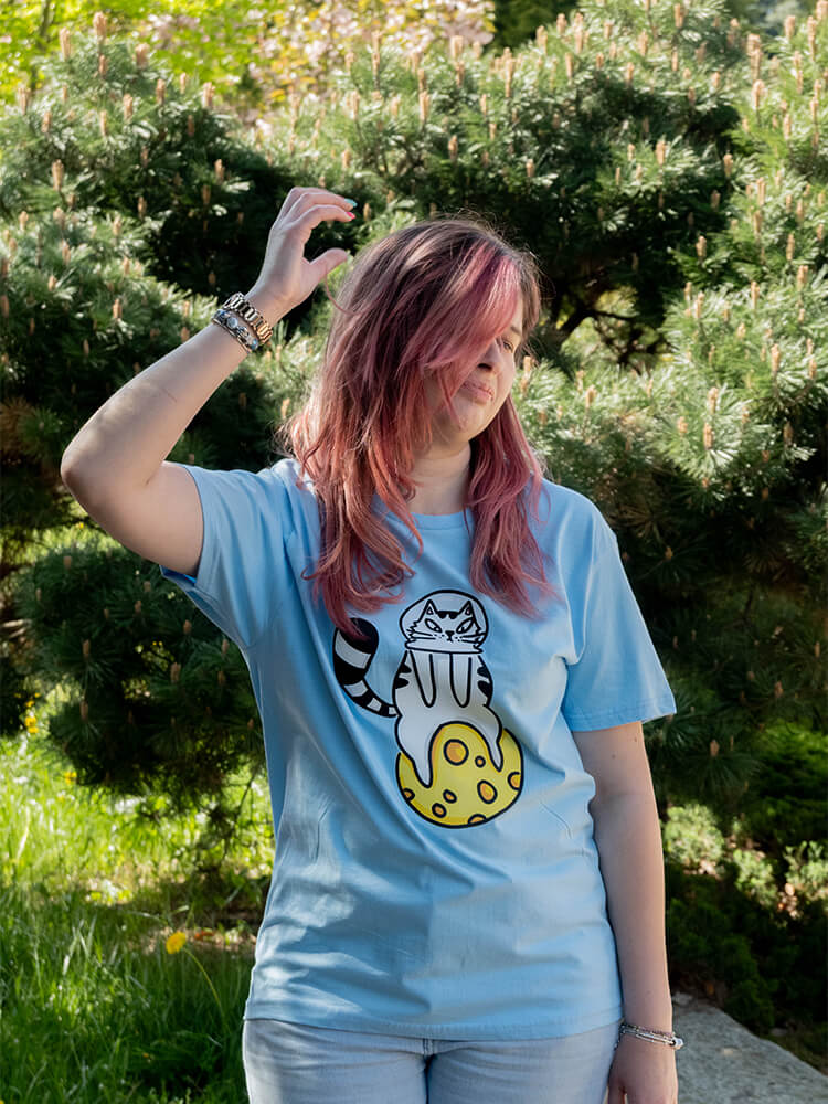 Niebieska, bawełniana koszulka z kotem o gramaturze 190 g/m2.
