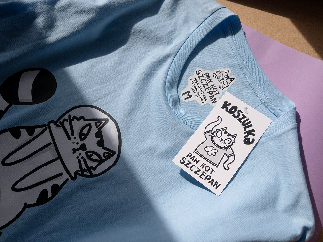 Niebieski T-shirt z miękkiej bawełny o gramaturze 190 g/m2. Dłuższy krój i miękki materiał sprawią, że ta kocia koszulka szybko stanie się Twoją ulubioną! Każdy egzemplarz ozdobiony jest autorskim nadrukiem inspirowanym przygodami Pana Kota Szczepana.