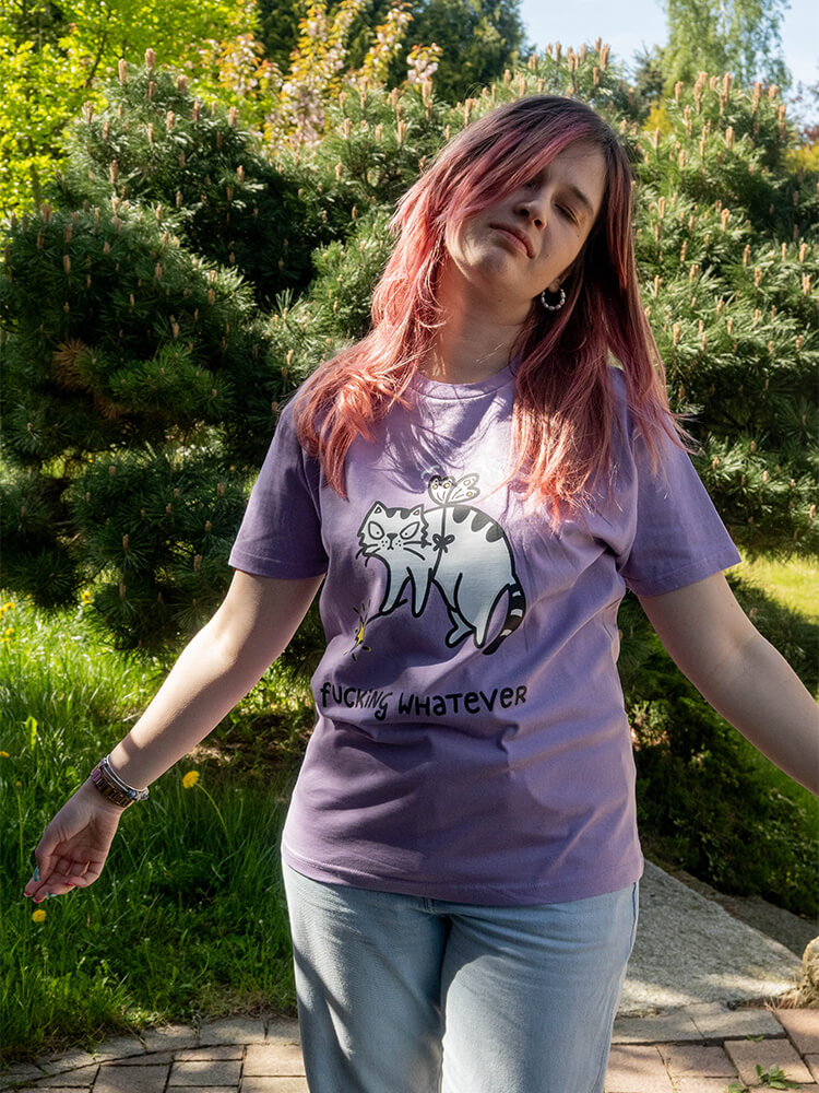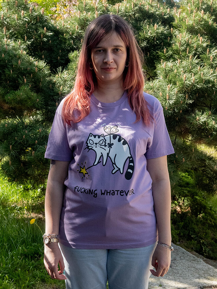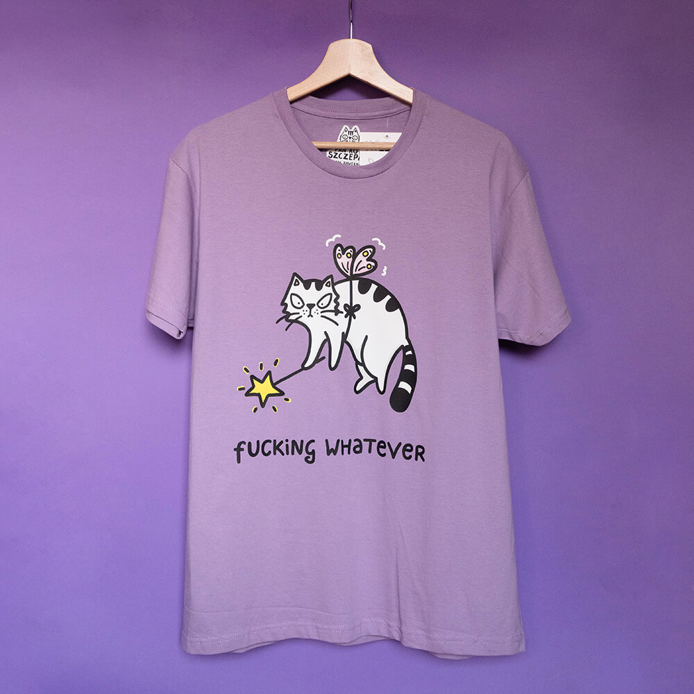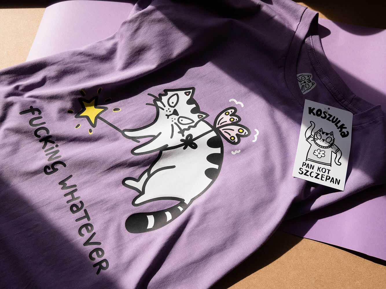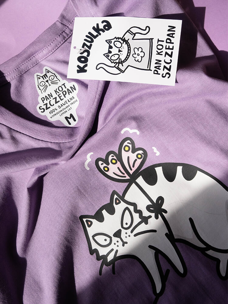 Fioletowy T-shirt z miękkiej bawełny o gramaturze 190 g/m2. Dłuższy krój i miękki materiał sprawią, że ta kocia koszulka szybko stanie się Twoją ulubioną! Każdy egzemplarz ozdobiony jest autorskim nadrukiem inspirowanym przygodami Pana Kota Szczepana.