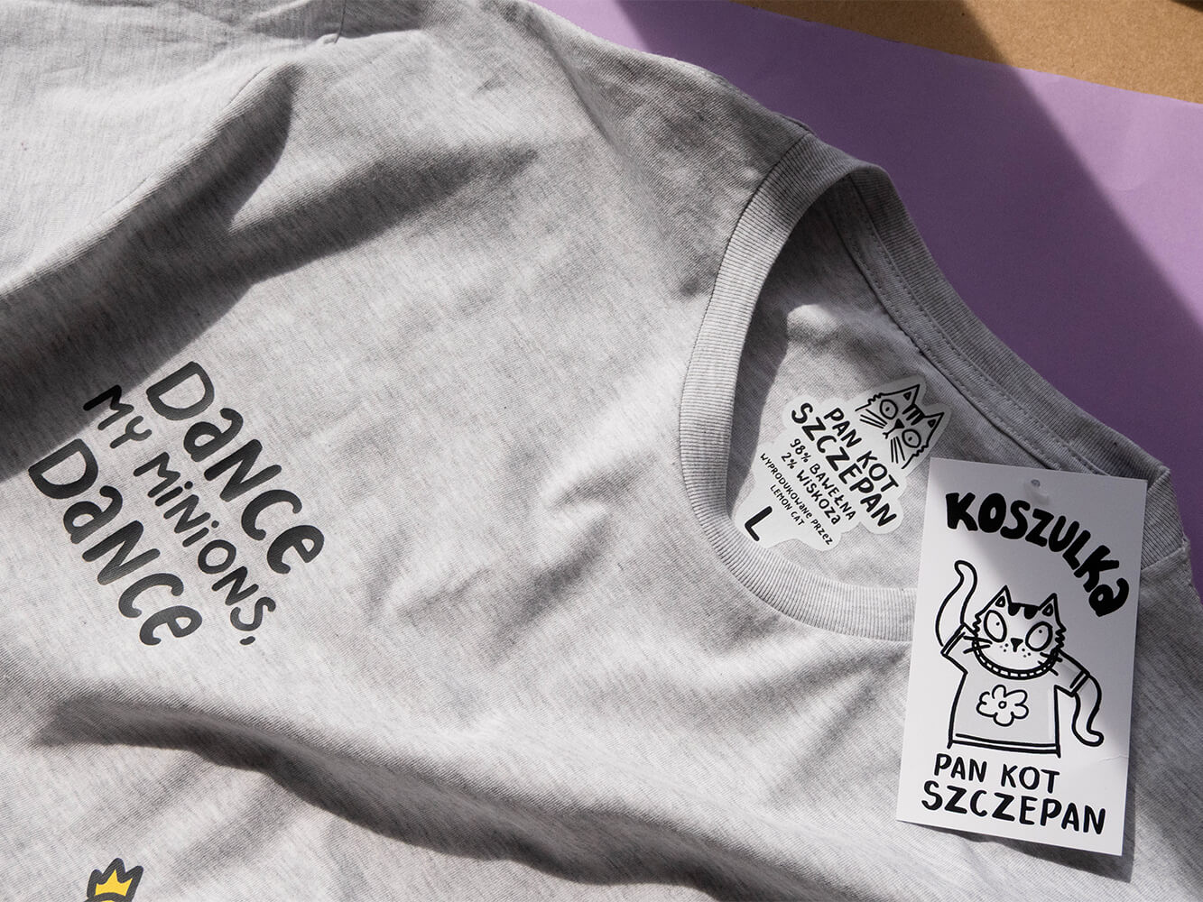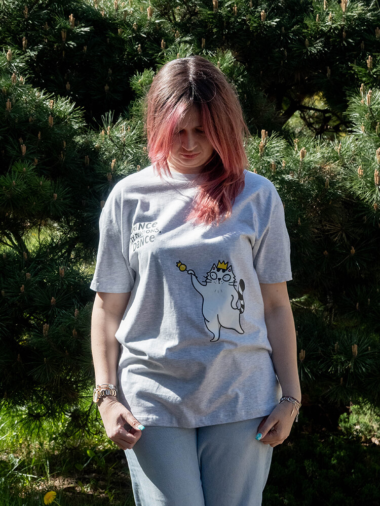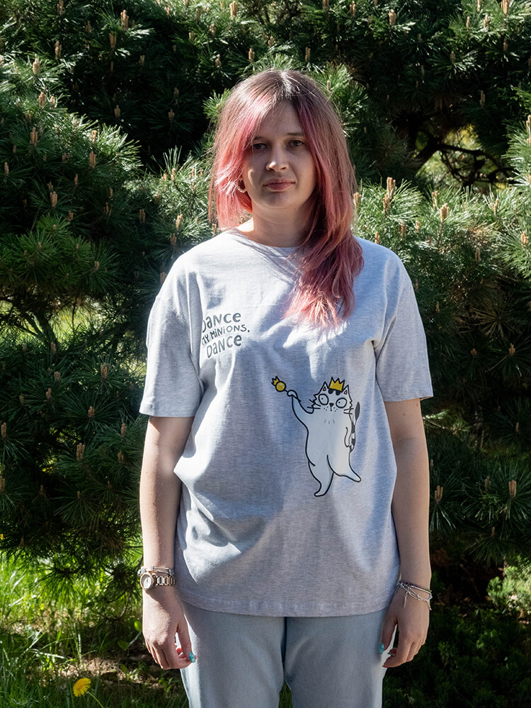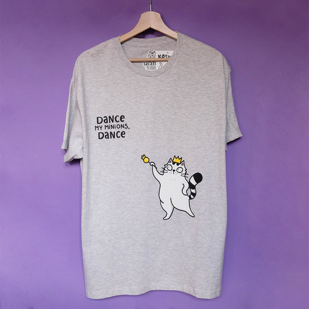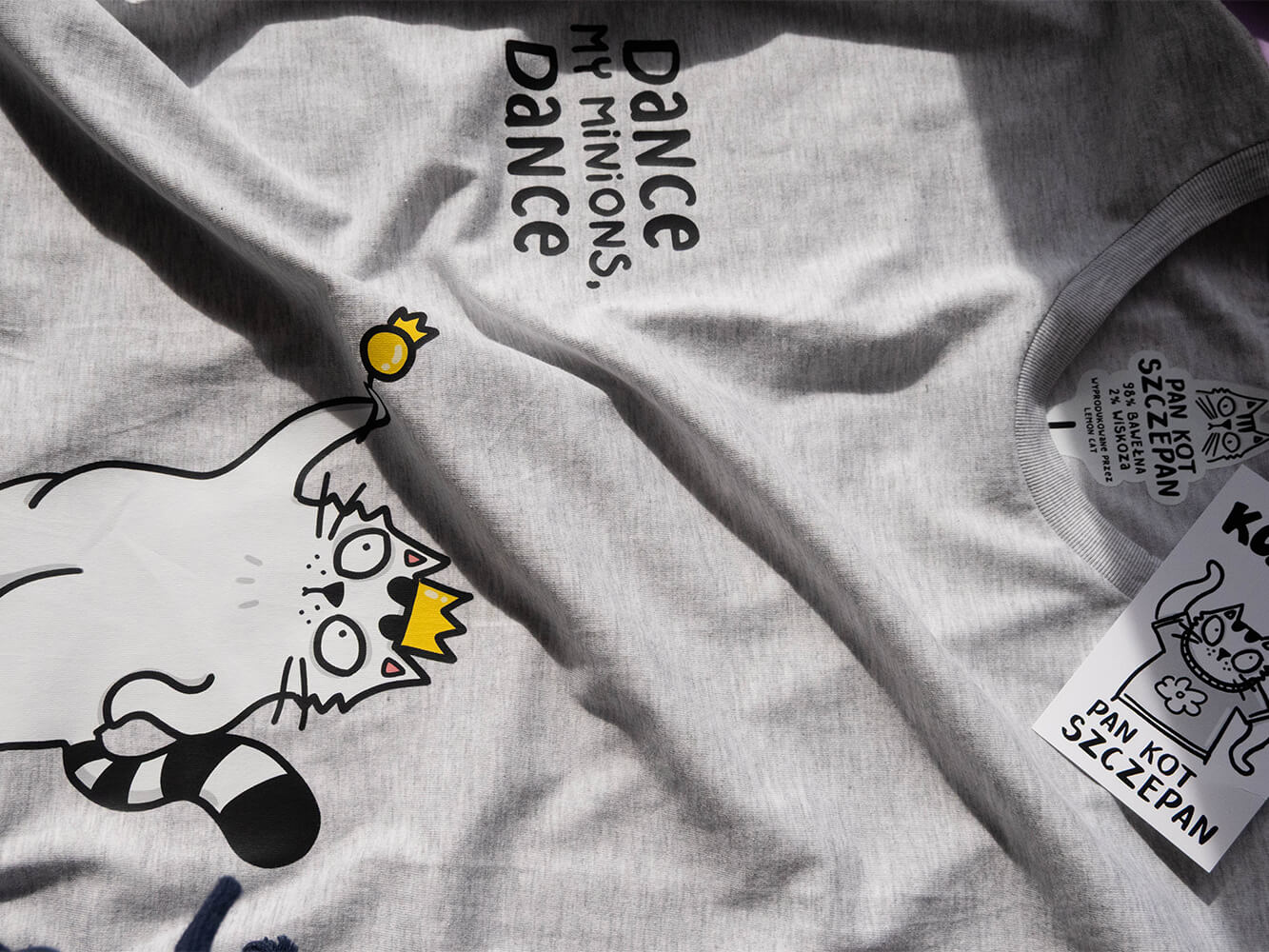 Klasyczny, szary T-shirt z miękkiej bawełny o gramaturze 190 g/m2 z niewielkim dodatkiem wiskozy. Dłuższy krój i miękki materiał sprawią, że ta kocia koszulka szybko stanie się Twoją ulubioną! Każdy egzemplarz ozdobiony jest autorskim nadrukiem inspirowanym przygodami Pana Kota Szczepana.