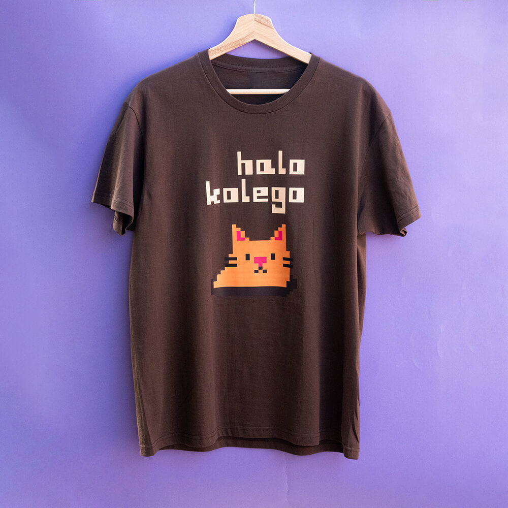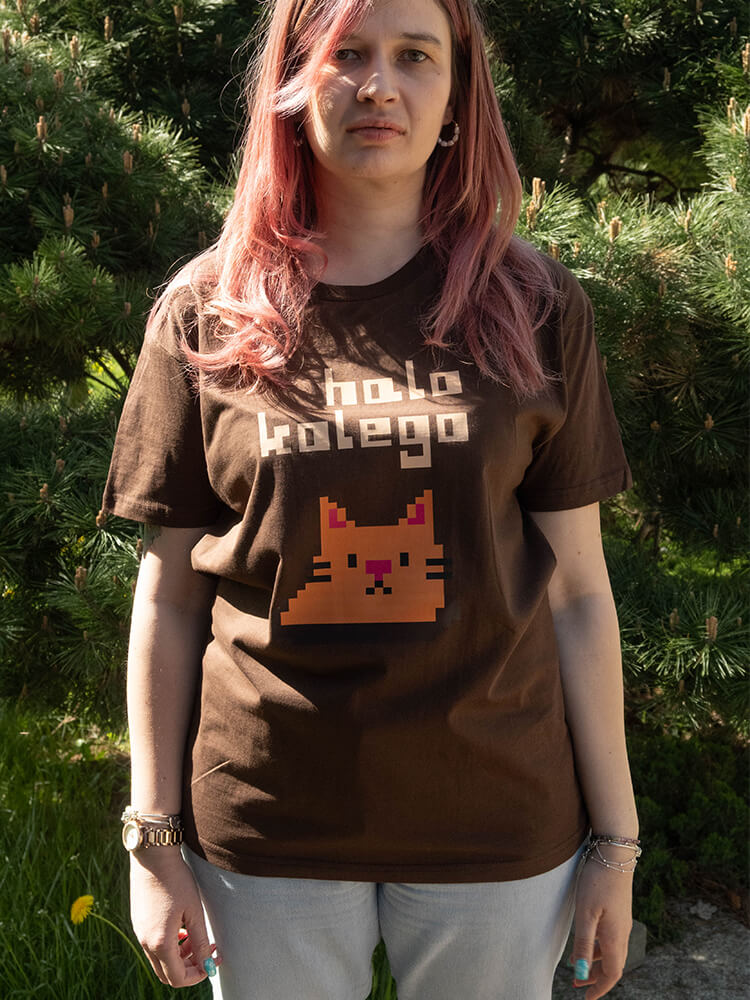 Brązowy T-shirt z miękkiej bawełny o gramaturze 190 g/m2. Dłuższy krój i miękki materiał sprawią, że ta kocia koszulka szybko stanie się Twoją ulubioną! Każdy egzemplarz ozdobiony jest autorskim nadrukiem w pikselowym stylu, inspirowanym przygodami Typa Gołębia.