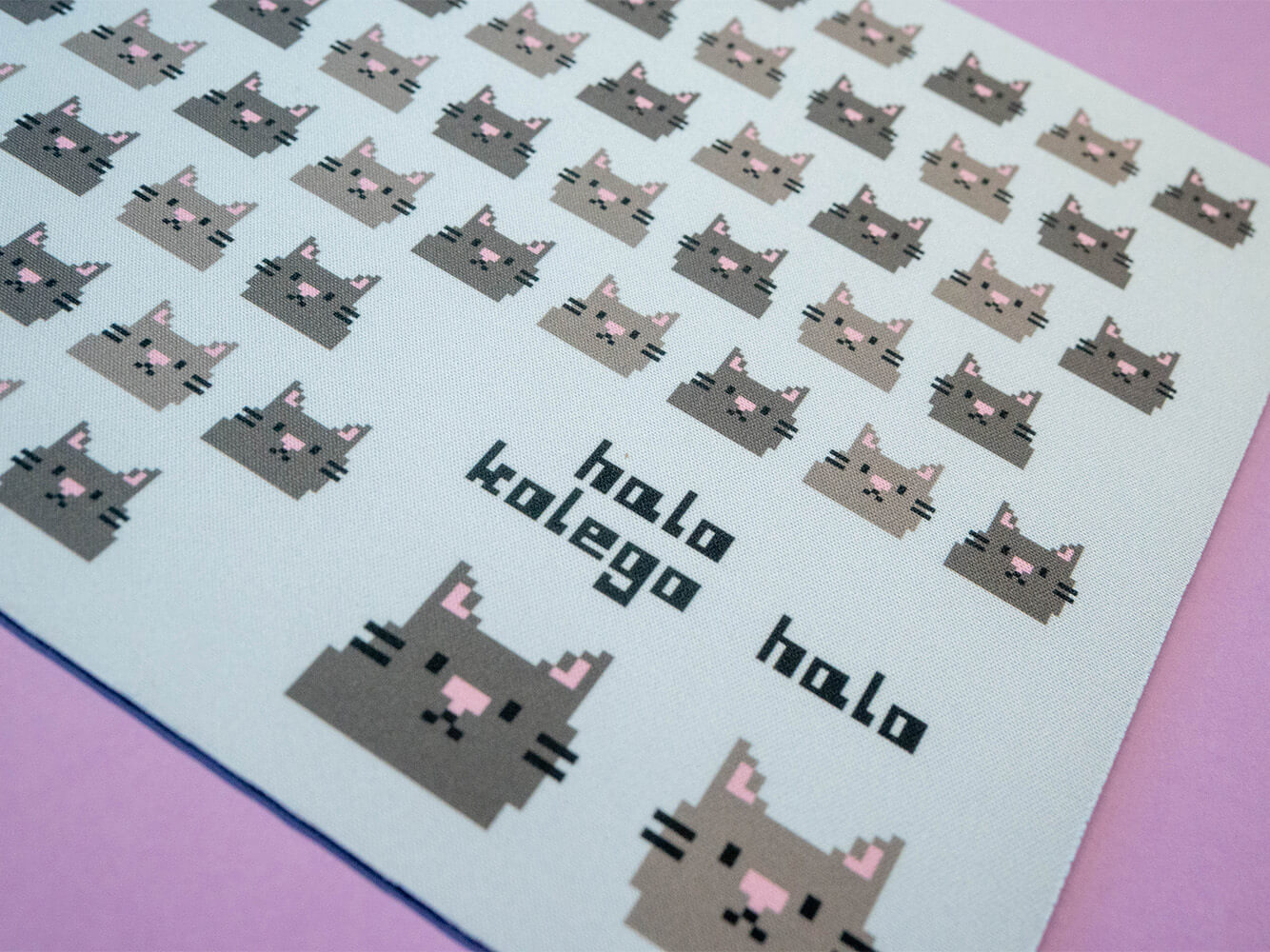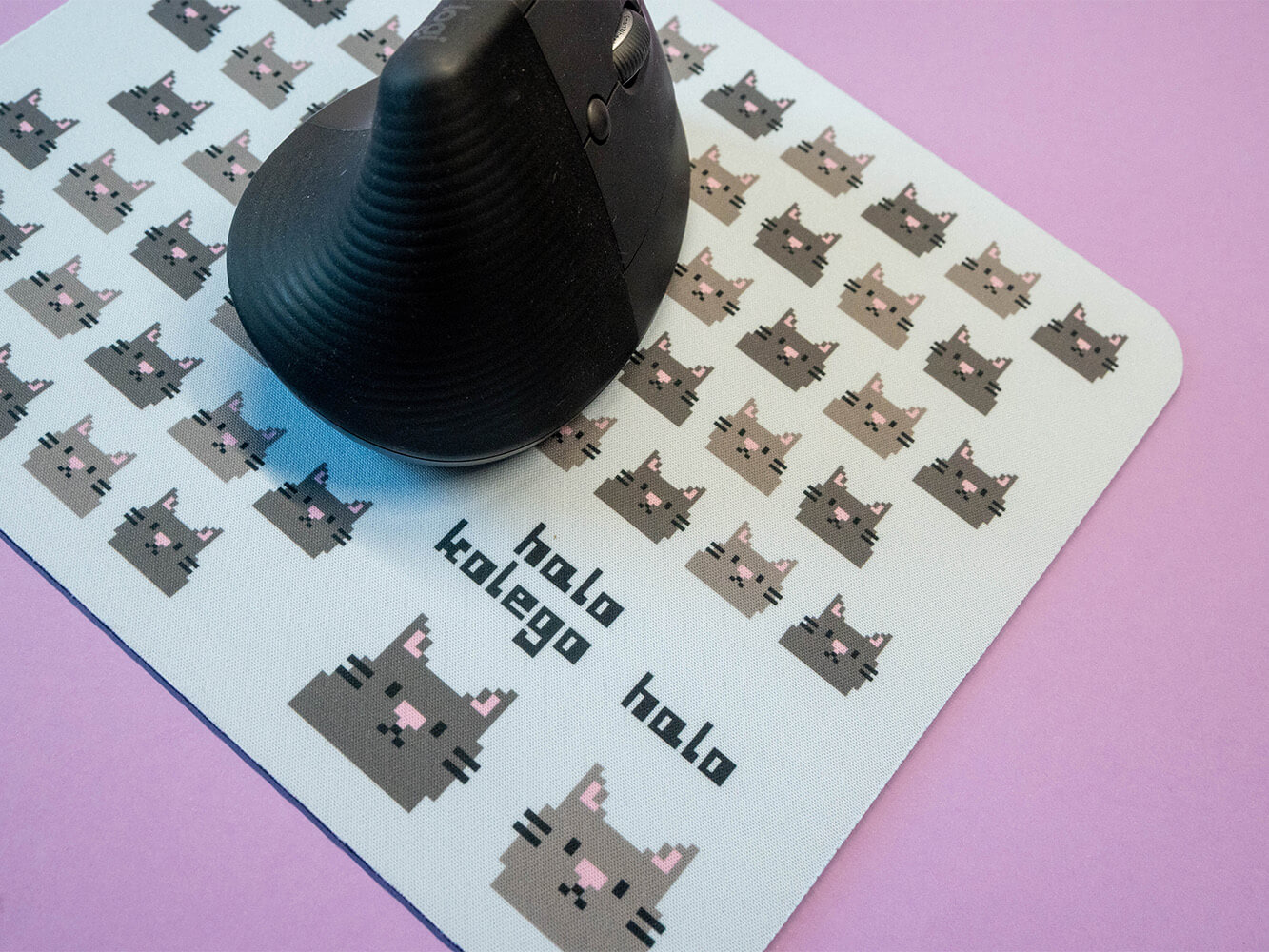 Podkładka pod myszkę o wymiarach 22 x 18 cm z deseniem w pikselowe koty, które się ze sobą witają.