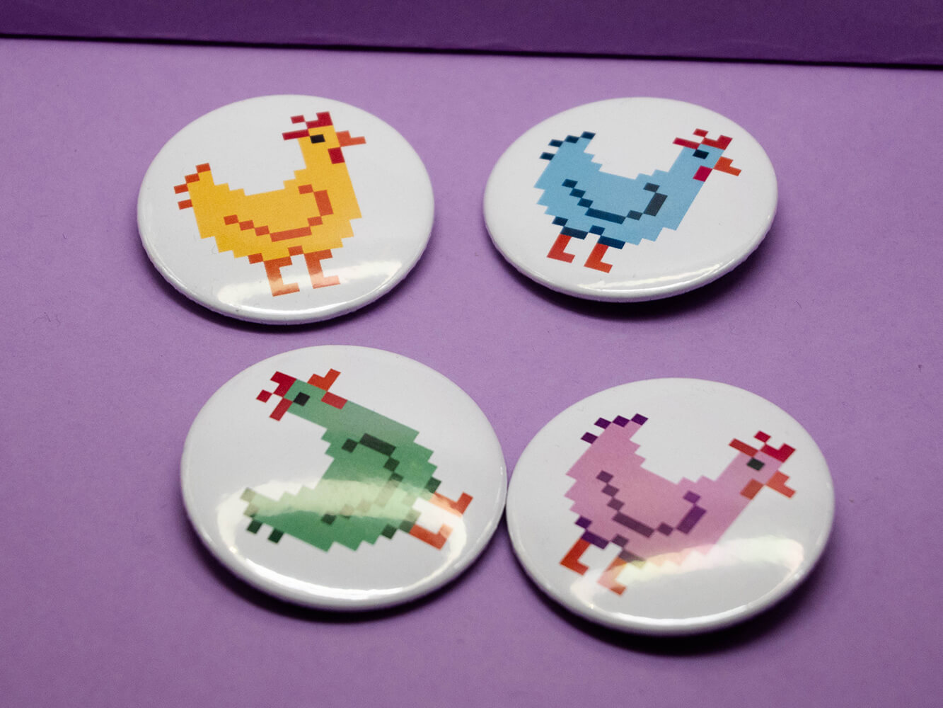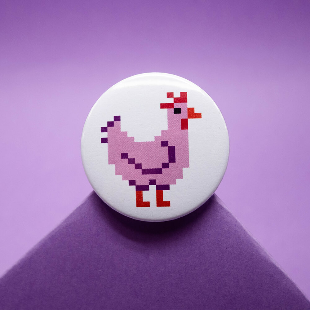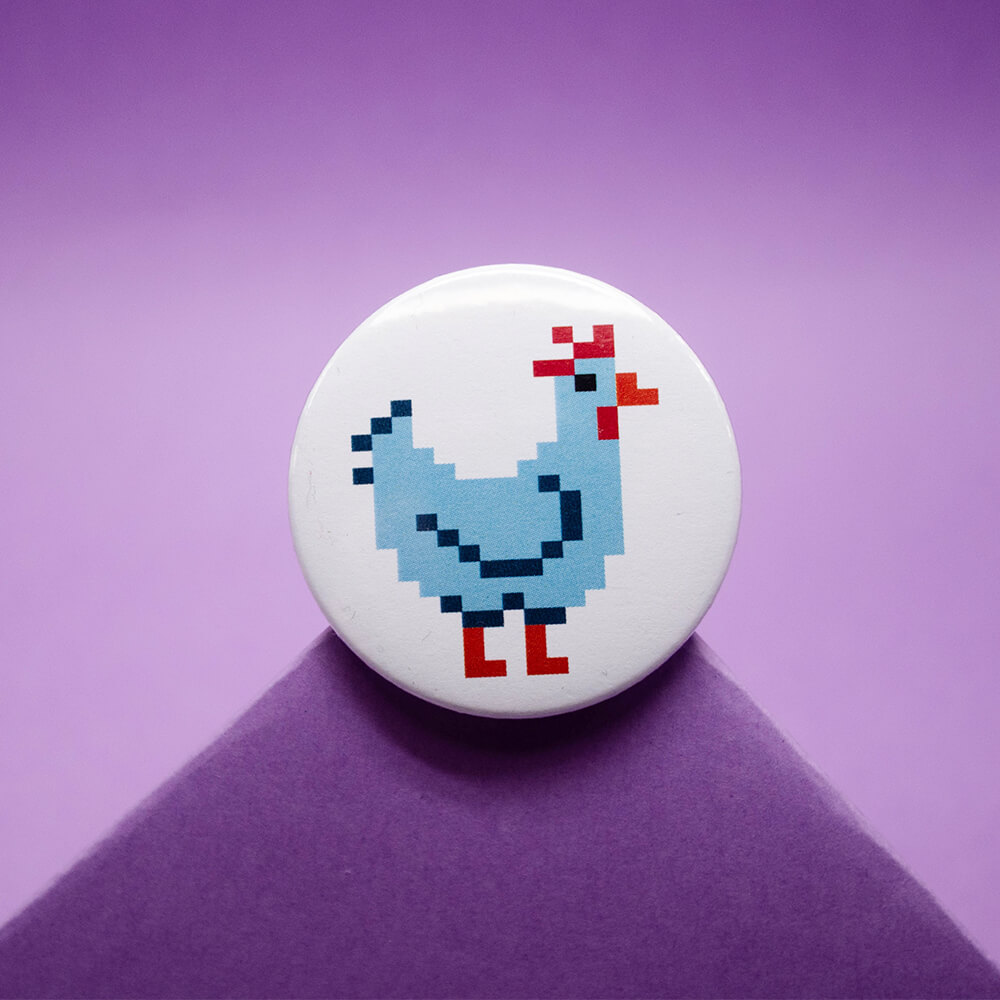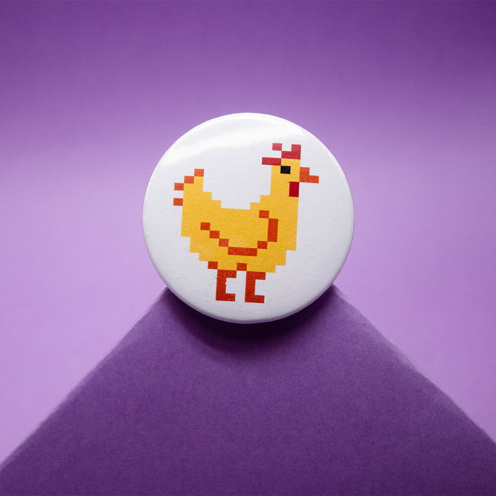 Przypinka z kurą w wybranym kolorze o średnicy 44 mm.