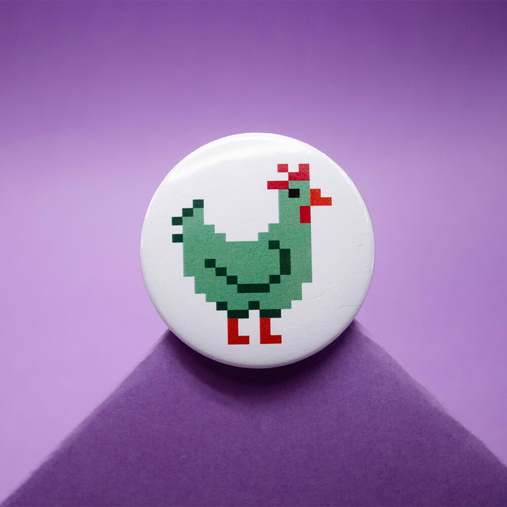 Przypinka z kurą o średnicy 44 mm.