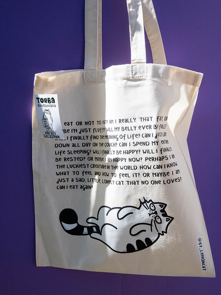 Beżowa torba z Panem Kotem Szczepanem idealna na zakupy i inne Twoje drobiazgi. Wymiar: ok. 38 x 42 cm, długość uchwytów: ok. 67 cm.