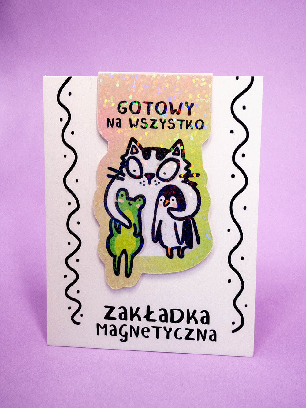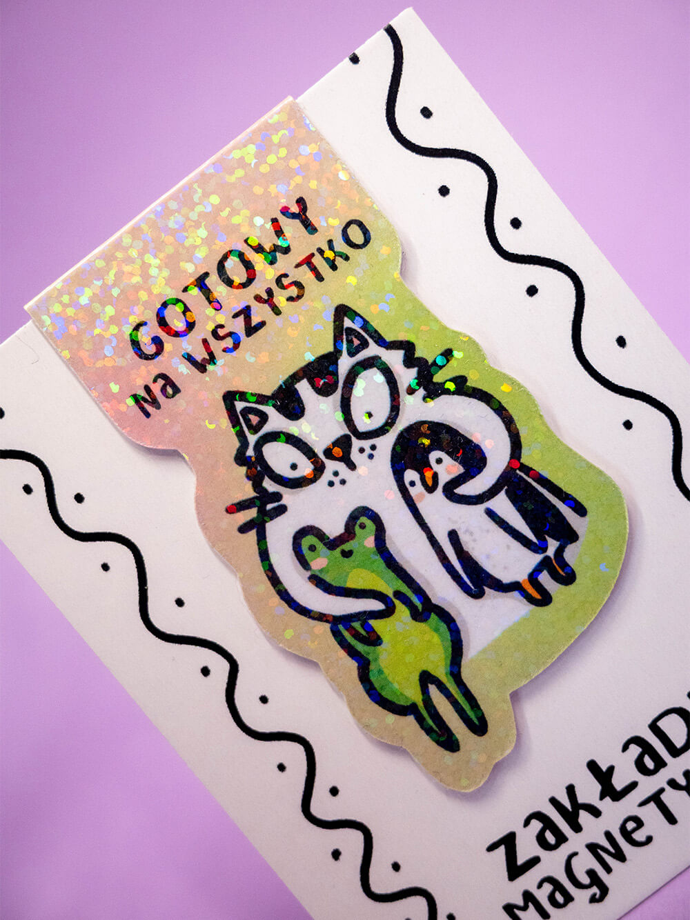 Zakładka magnetyczna z Kotem, żabą i pingwinem. Powlekana folią holograficzną.