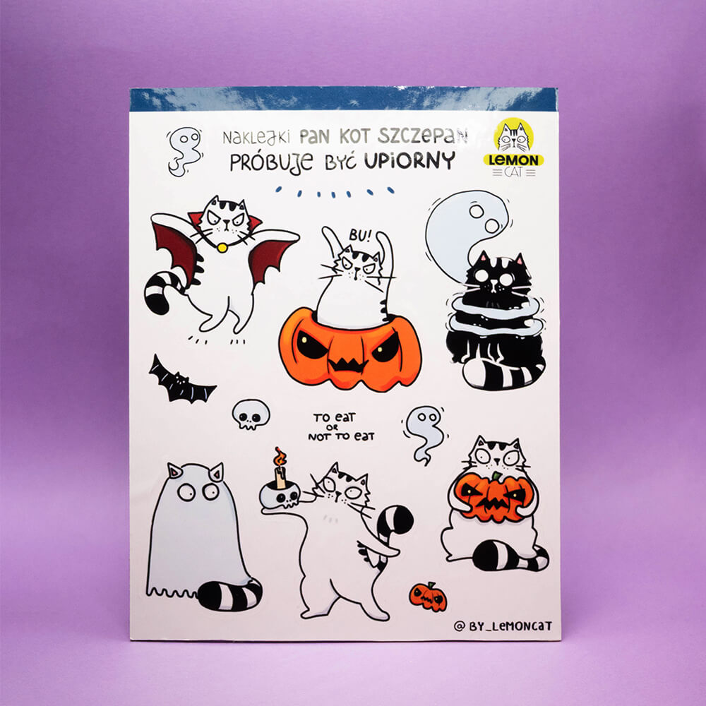 Kolejny arkusz naklejek dokumentujący przygody Pana Kota Szczepana. Który to już raz ten puchaty jegomość pakuje się w kłopoty, których (sądząc po wyrazie pyszczka) nawet do końca nie rozumie? Nie jest też pewien, jak właściwie się w nich znalazł… Otuchy na pewno doda mu Twoje zainteresowanie. Bo przecież jest Kotem, więc na tym (oprócz jedzenia i wygodnego miejsca do spania) zależy mu najbardziej. Naklej te urocze naklejki gdziekolwiek zechcesz, a Pan Kot Szczepan będzie towarzyszył Ci przez cały czas!