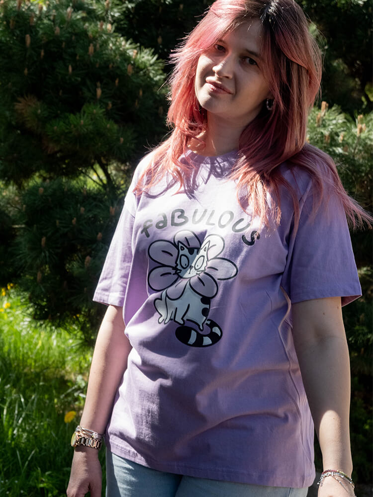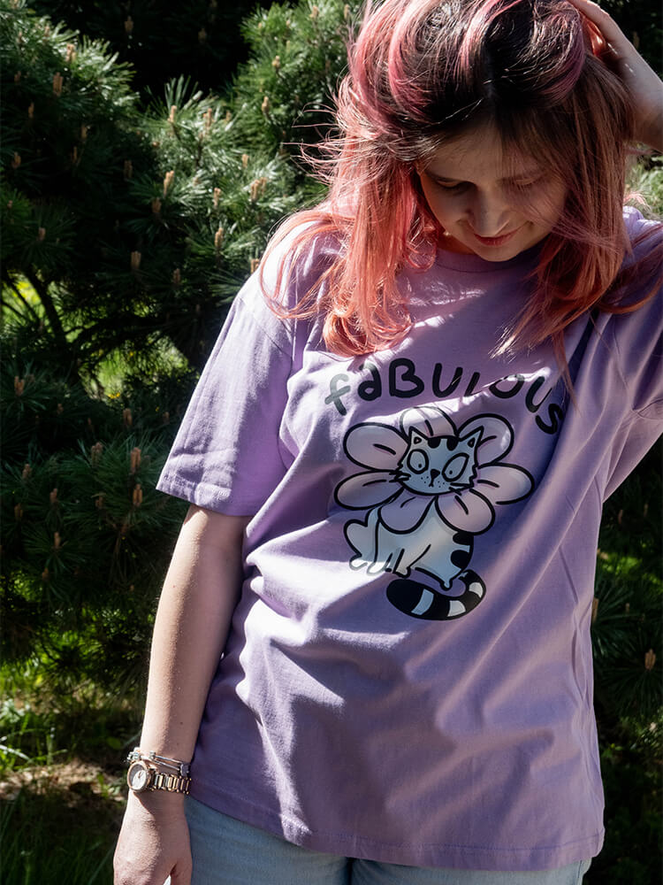 Fioletowy T-shirt z miękkiej bawełny o gramaturze 190 g/m2. Dłuższy krój i miękki materiał sprawią, że ta kocia koszulka szybko stanie się Twoją ulubioną! Każdy egzemplarz ozdobiony jest autorskim nadrukiem inspirowanym przygodami Pana Kota Szczepana.