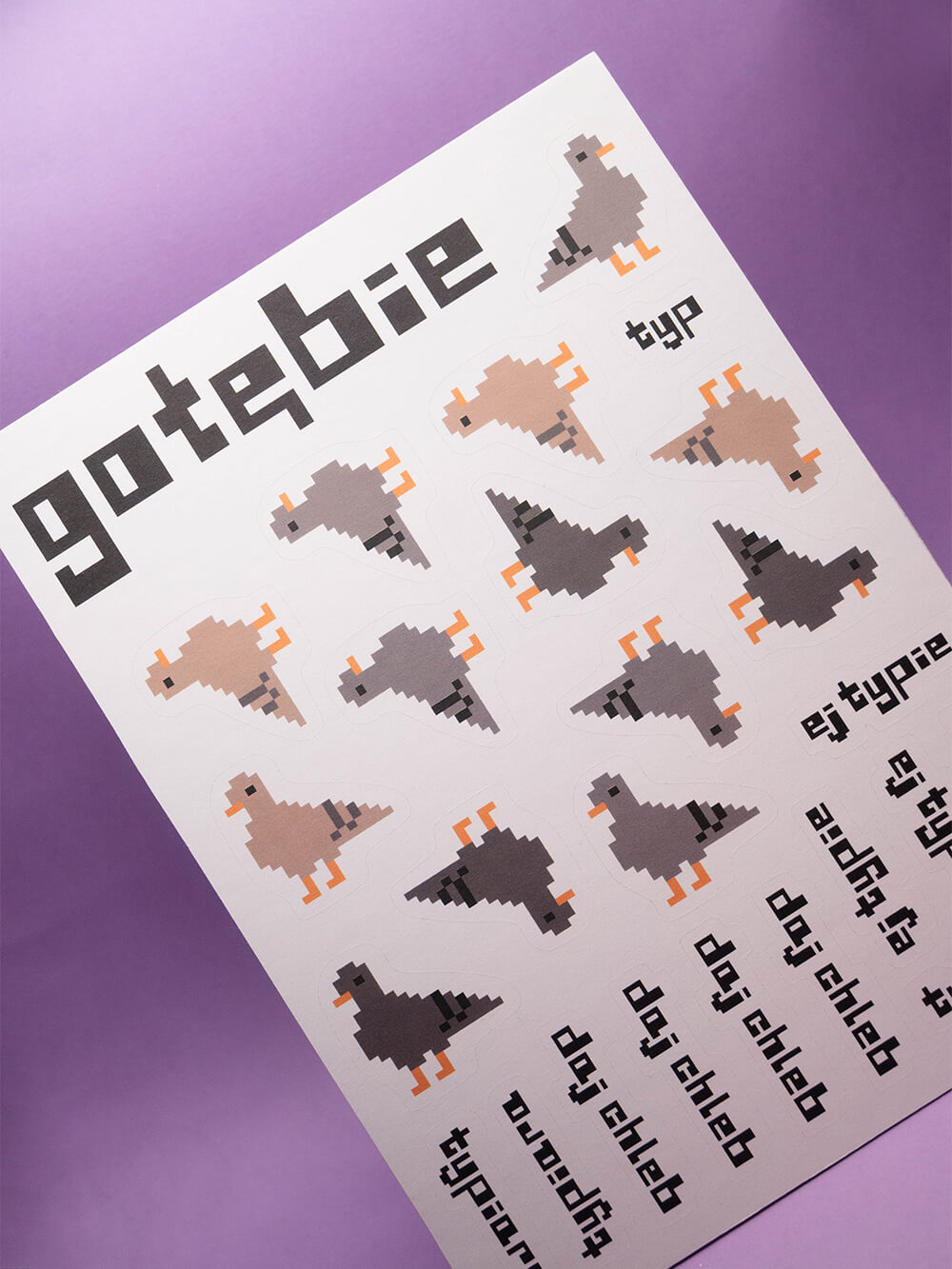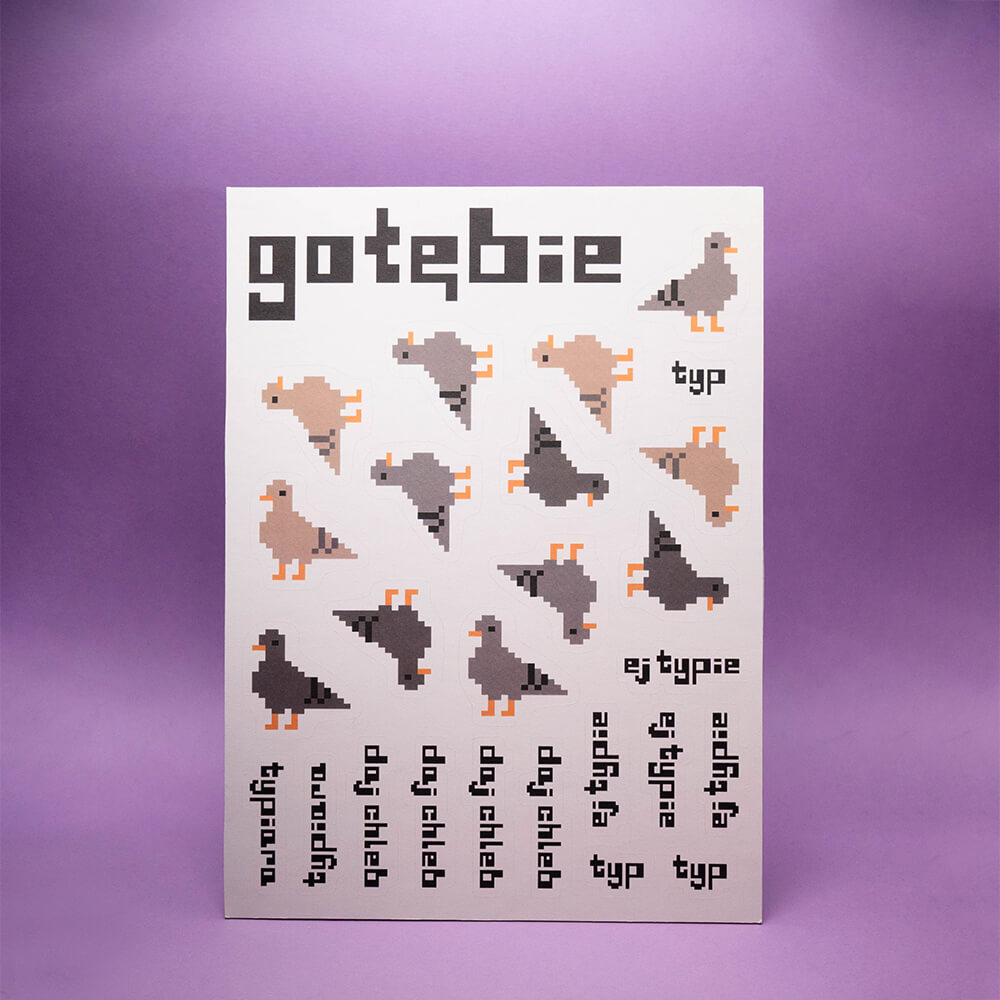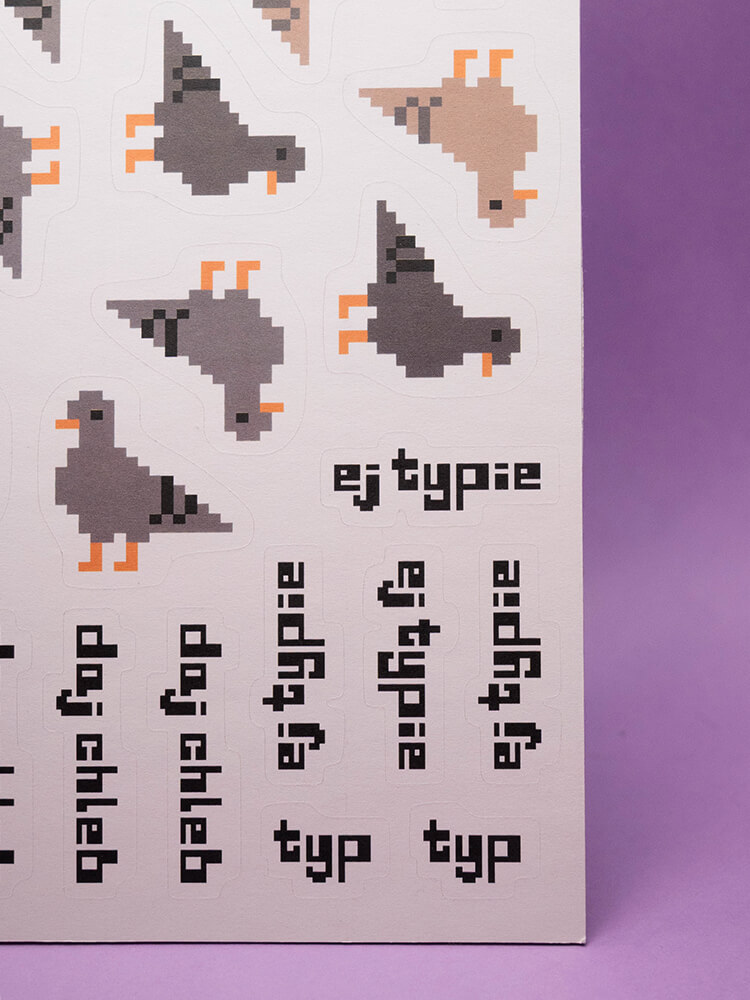 Arkusz z kilkunastoma gołębiami w różnych kolorach. Jest Typ, jest jego kolega, no i oczywiście jest Typiara! Oprócz gołębi znajdziesz tu też napisy. I teraz już możesz naklejać wszędzie rozmawiające gołębie. Co prawda one się tylko ze sobą witają i proszą o chleb, ale szczerze mówiąc nie sądzę, żeby takie gołębie były w stanie mówić coś więcej. No chyba, że znajdą wreszcie chleb, ale na to się nie zapowiada…